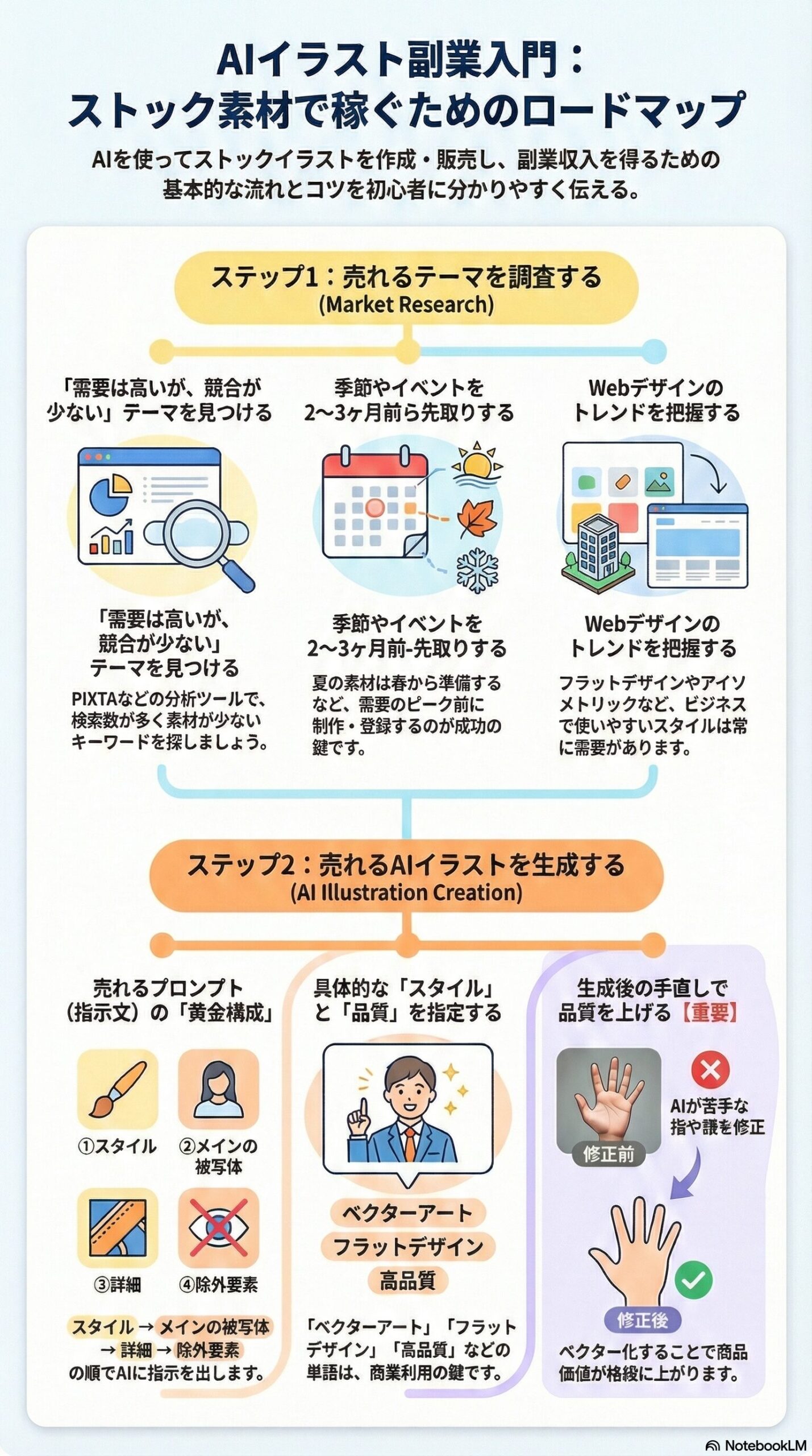 イラスト作成も楽しくなりそうなんですが、その作成方法の勉強中でもこんなに楽しいなんて思いませんでした。これから皆さんと一緒にイラストの販売までnotebook LMを使った動画も公開していこうと思います。