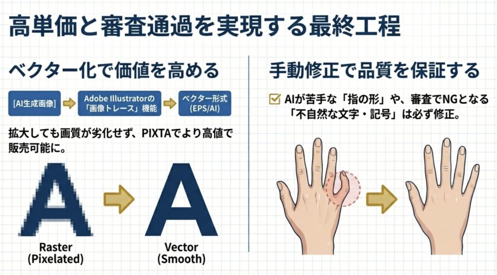 AIは時として、人間にはありえないミスを犯します。これを放置すると、PIXTAの審査落ちを招くだけでなく、購入者の信頼を損ないます。